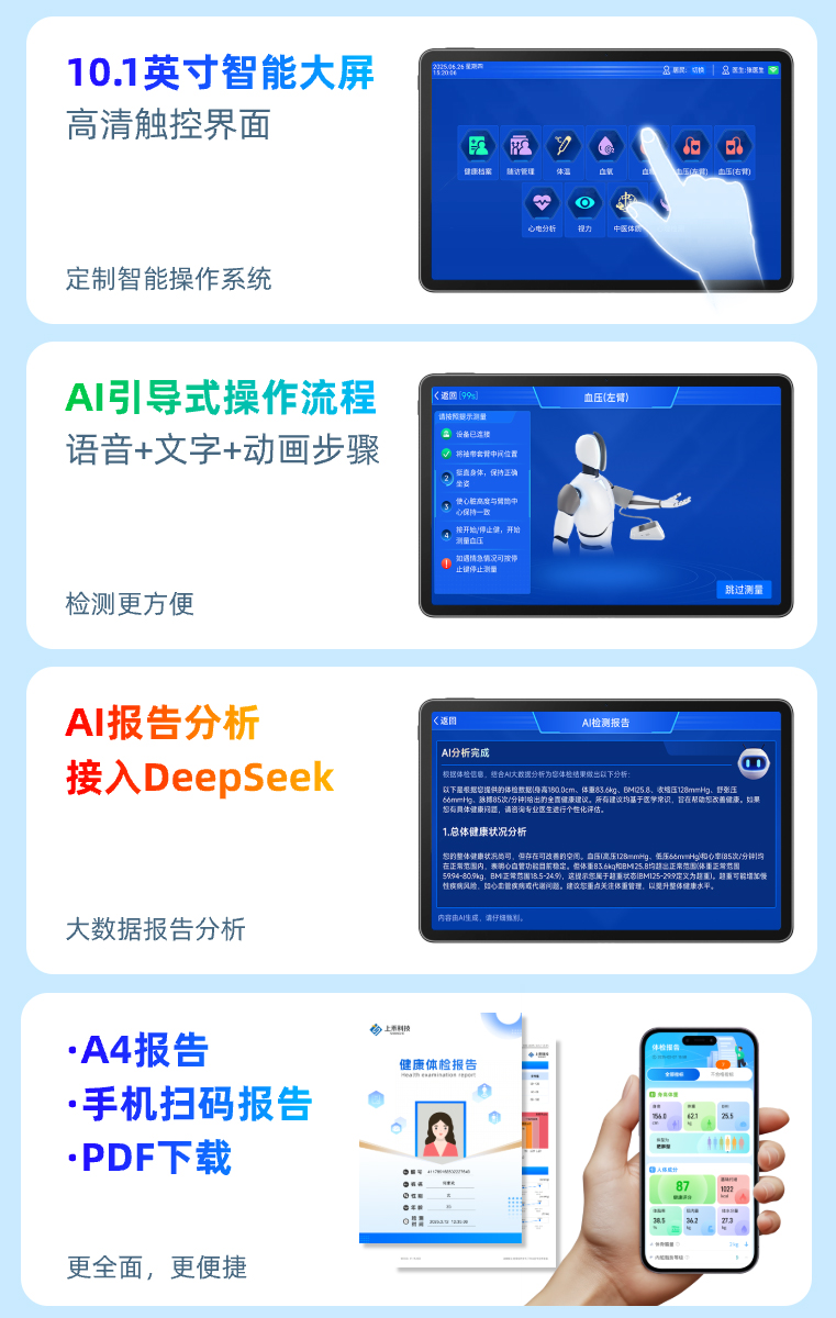 SH-203便攜式健康體檢一體機是上禾針對基層公衛推出的一款便攜式公共衛生檢測設備,可以通過平板電腦等數據采集終端和數據管理軟件系統實現一體化整合,實現血壓、心率、血氧、體溫、心電、血糖、尿酸、血紅蛋白、血脂四項、尿常規等多種參數檢測,快速建立居民電子健康檔案,與信息管理平臺或健康檔案管理系統進行數據交互傳輸,可上傳或成批次/單獨下載調用數據,并提供接口開發包,支持將采集到的健康數據上傳至區域信息平臺或健康檔案管理系統。支持隨訪管理以及AI報告分析,支持PDF報告上傳。